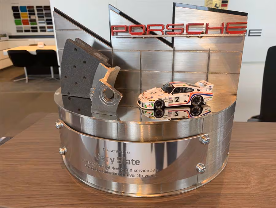 Designed by Dustin Gilleland at Porsche Cars North America's headquarters in Atlanta, each of the 18-pound steel awards are hand-fabricated by Fuller Moto in Atlanta. The award's backdrop represents the roofline and signage of the original Porsche factory in Stuttgart, Germany. The curved front of each award represents the updated Generation 4 design of current Porsche dealerships. Each award also features a cut section of a Porsche ceramic composite brake rotor as a symbol of the work technicians do and a model car to represent the decade the technician joined Porsche.