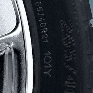 Tire size: is determined by width in millimetres (265), height/width ratio in percent (40), tire construction (R = radial tire) and rim diameter in inches (21).
